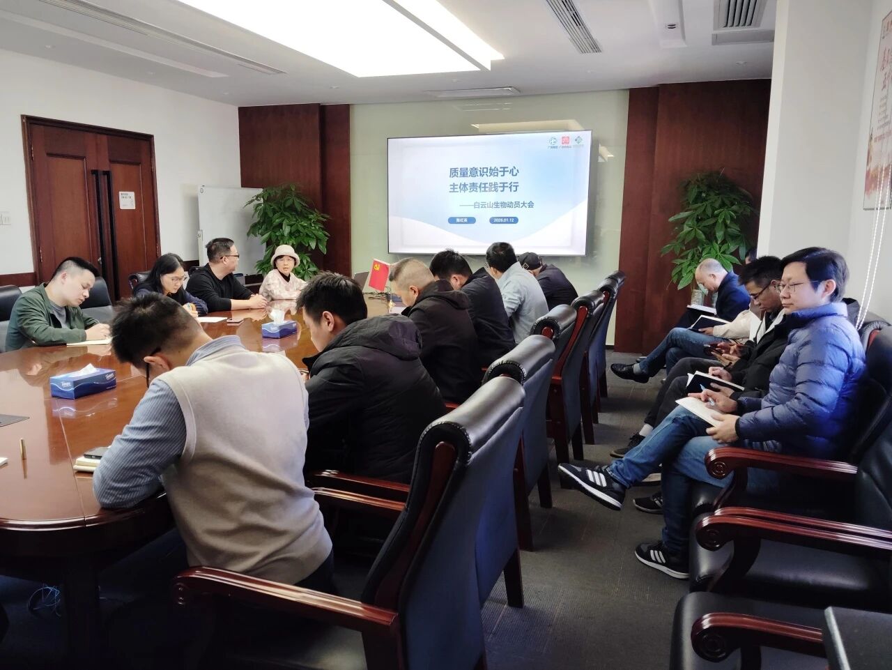 1月12日,白云山生物质量动员大会在生产中心二楼大会议室顺利召开。本次大会以“质量意识始于心,主体责任践于行”为主题,明确了2026年生产质量工作的重点任务。公司生产、质量、安全保障及药物警戒等相关部门负责人与业务骨干参加会议。会议由总经理陈红英主持。